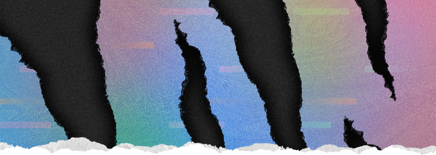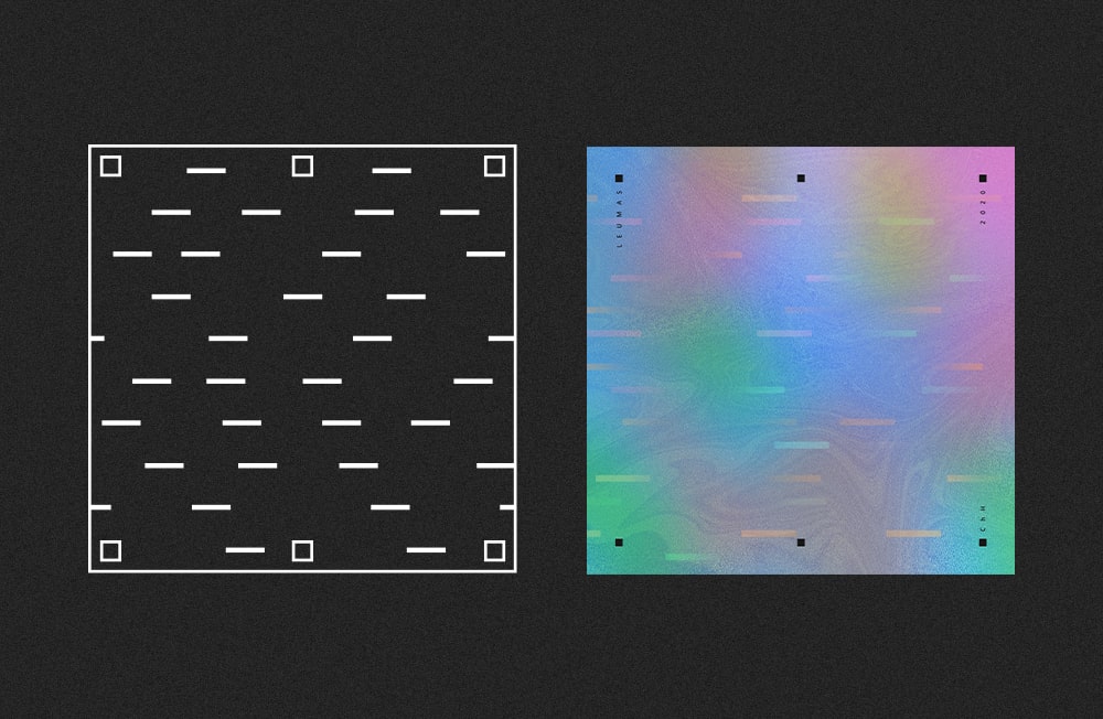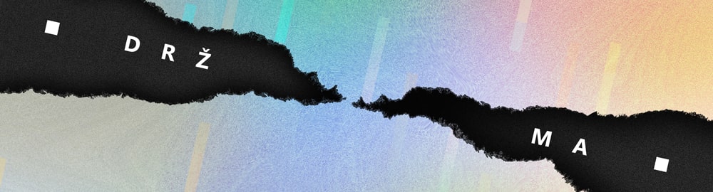 The foreground surface contains a pattern created from short horizontal lines. The pattern's role is to contrast the jagged tears and give the whole design a calmer feel. Finally, I equipped the design with anchor points — squares, which are located in six places of the format and bind textual information. They have a similar function as the colored lines.