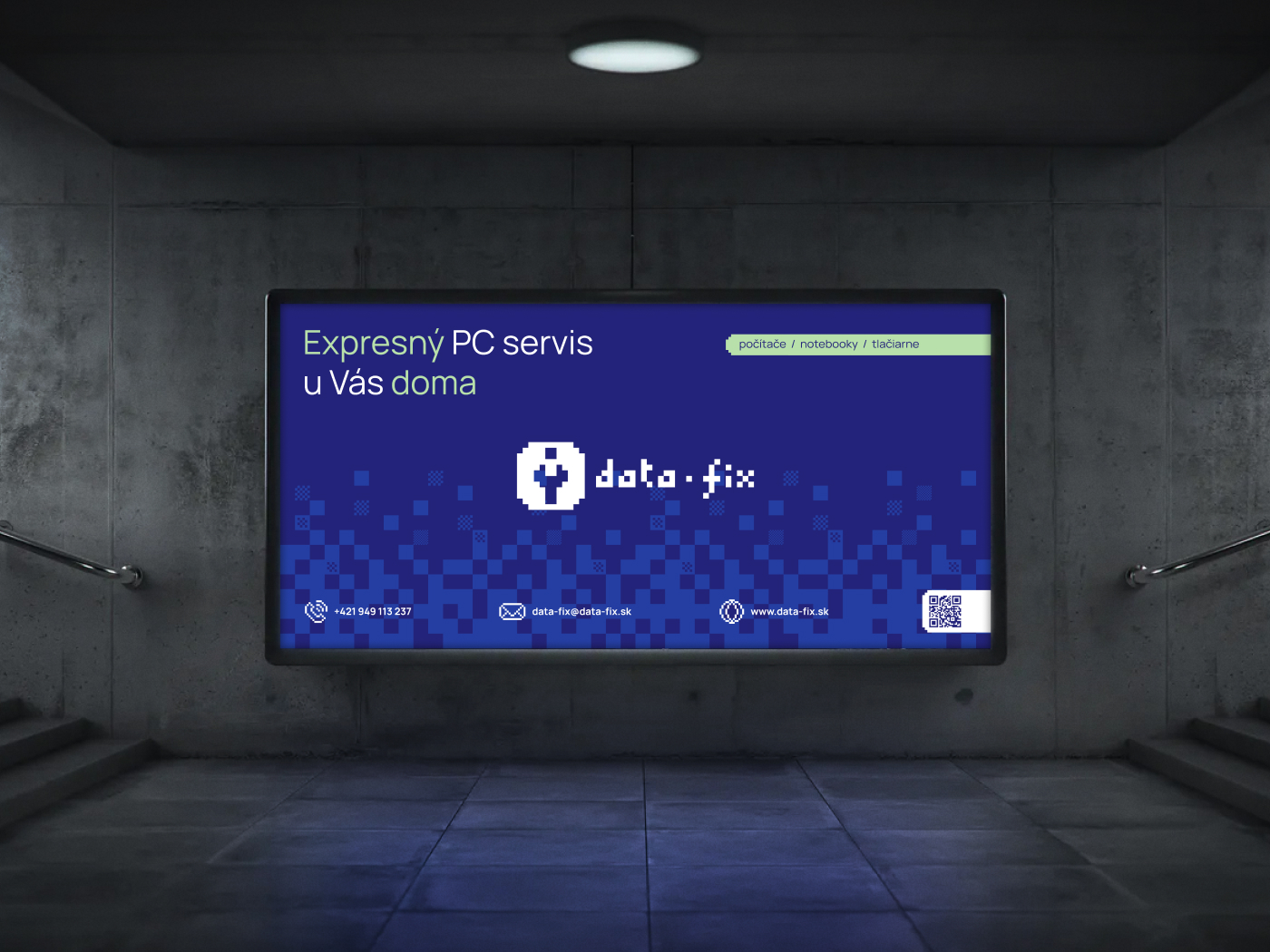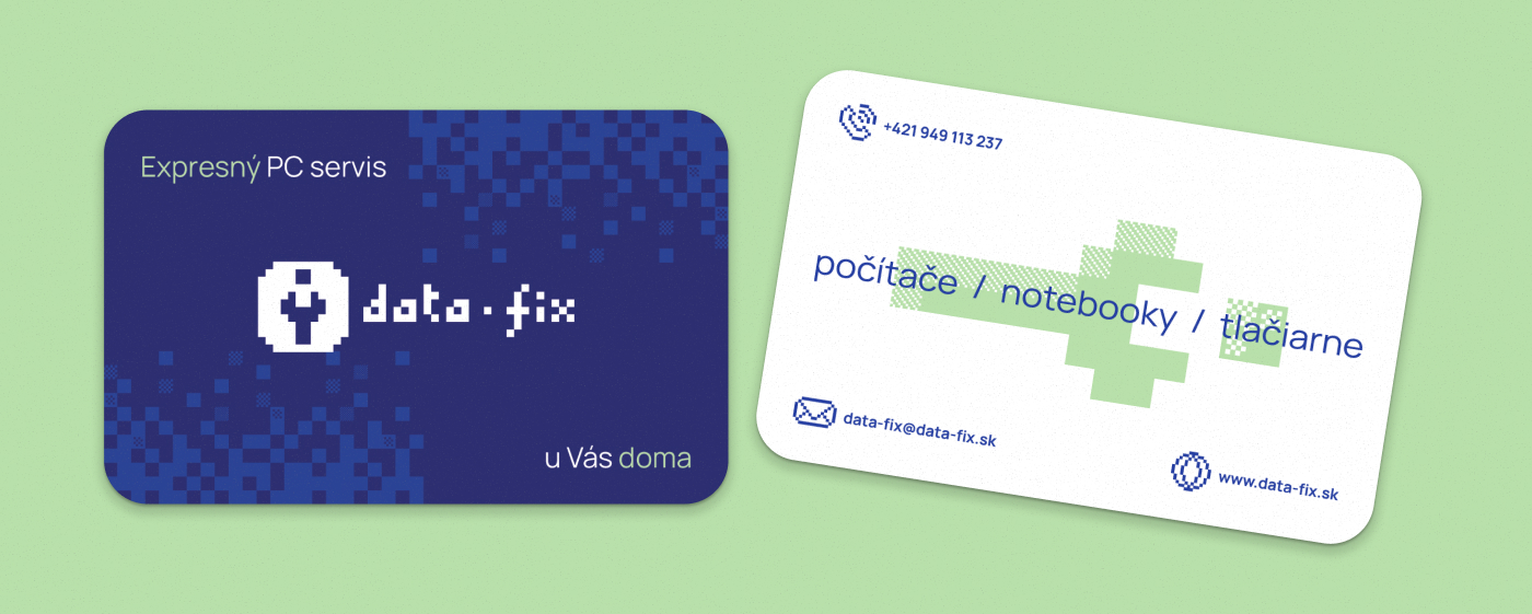 DataFix was developed as a complete brand from the ground up — including naming, brand claims, visual identity, and website design. The core concept is built around pixel-based graphics, referencing the fundamental building blocks of digital technology. At the center of the identity is a pixel-art wrench symbol, representing repair, technical expertise, and hands-on problem solving.